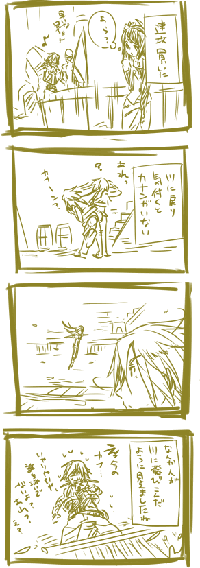 カナンとの逃避行、はじめて一発成功した。路地に逃げないよう移動して、果物ごろごろさせてた。