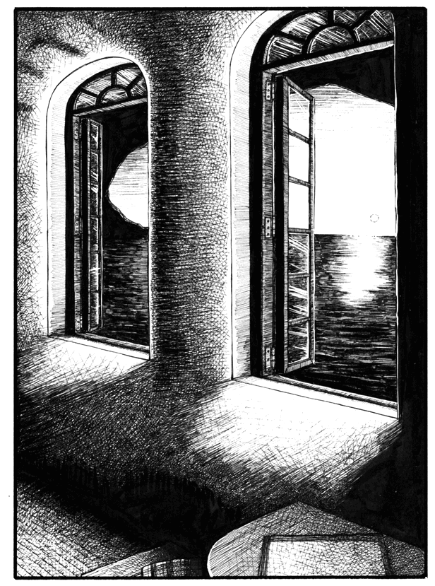 窓の外には、波にくり抜かれた崖の岩盤の向こう、夕暮れの泳ぐ海が穏やかに輝いている。