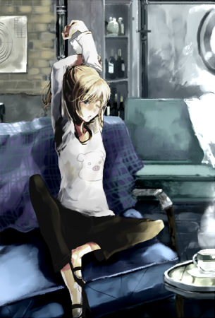 公式ブログのトップ絵とか壁紙のやつとか、ソファで並んで座る三人がかわいいです。ちっさいテレビがあって、なんつーの、お前らはアメリカンホームドラマかフルハウスか!というね。布だのの感じが生活臭ぷんぷんソファでとっても素敵。この絵の模様はテクスチャ作ればよかったなぁと反省。