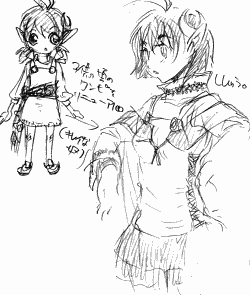 あと、脇が2の絵では見えないので、身頃が前後でわかれていて、紐で繋がってたりすることも、ありはありだなぁ、とか。んで、なんでそんな構造にするのよ、ということで、小さい頃のワンピ(特別用でキレイなまま残っていた)のをリフォームしたって手もありだなーとか妄想してただけの絵。(先日の、幼馴染三人絵のレナ服は、この絵からきてた)