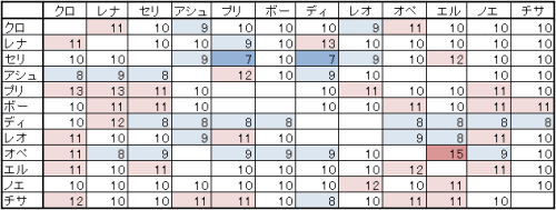 平均を愛5+友5の10が『普通』として上なら赤っぽく、下なら青っぽく。(最大値、最小値は色を濃めに)